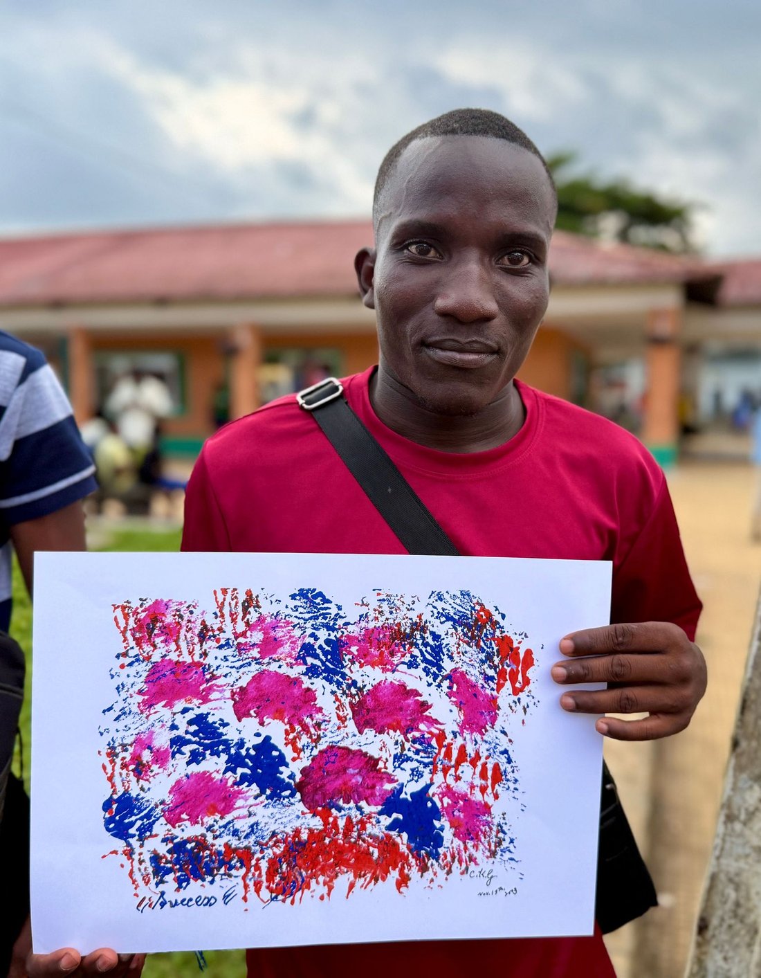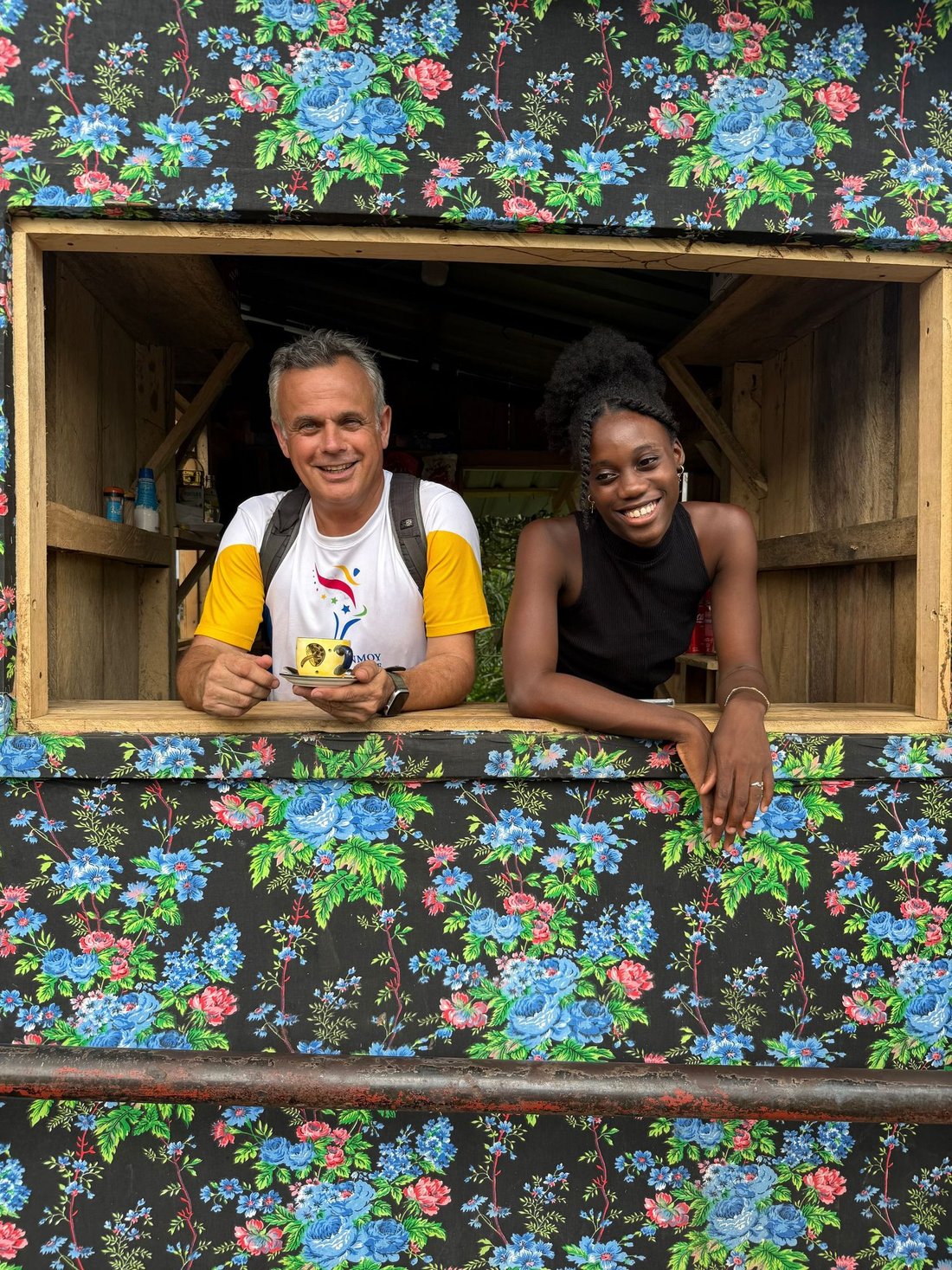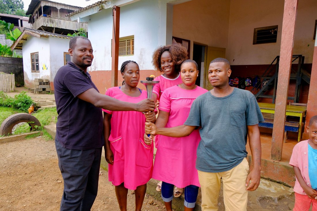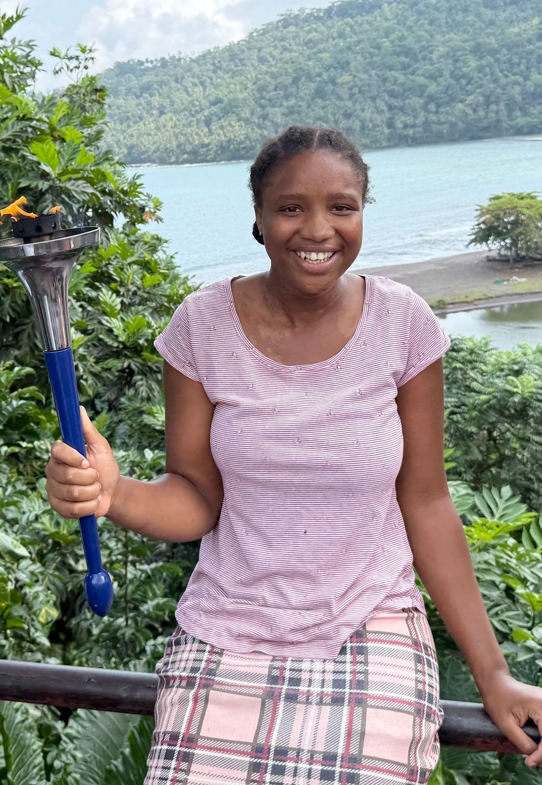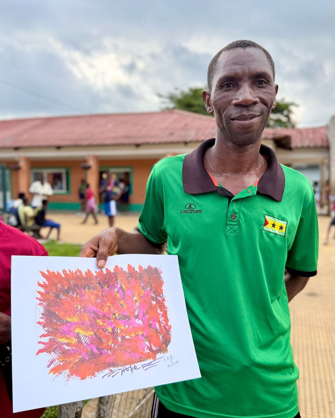 Father (João Carlos Nezó) and Son (Sandro Nezó) of Caué holding the Peace Torch! João Nezó, also known as Nezó, is a multifaceted artist from São Tomé, painter, escultor and musician. He is one of the responsibles of Zángoma workshop, in São João dos Angolares.