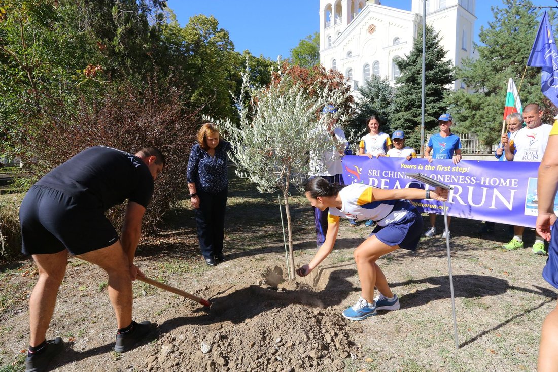 Then the oldest employee of the municipal administration in Rakovski, together with the oldest participant in the relay, planted a "Peace tree" in the green areas on the square. Children from the sports clubs, who have been running with the Peace torch since the beginning of the city, joined in the planting.