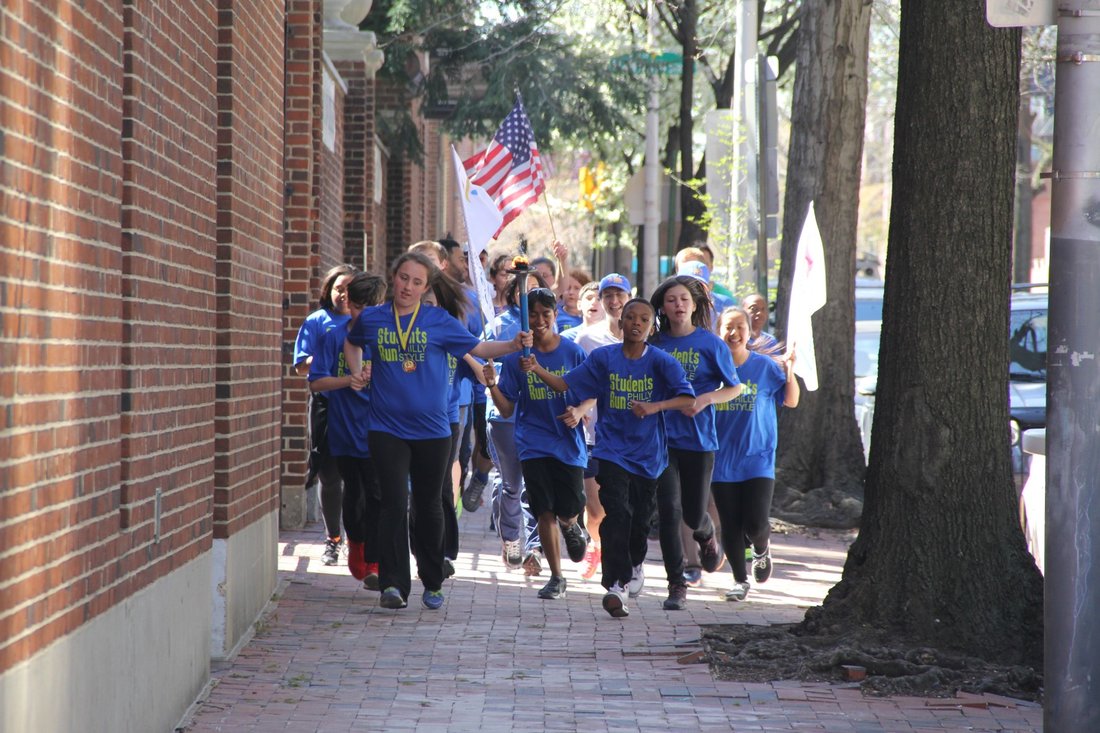 Some of the staff and student runners, called 'Students Run For Philly', and Athletic Director Chris Theodore and the Dean of Students pose with the Torch as they get ready to run to Independence Hall with us from their school.