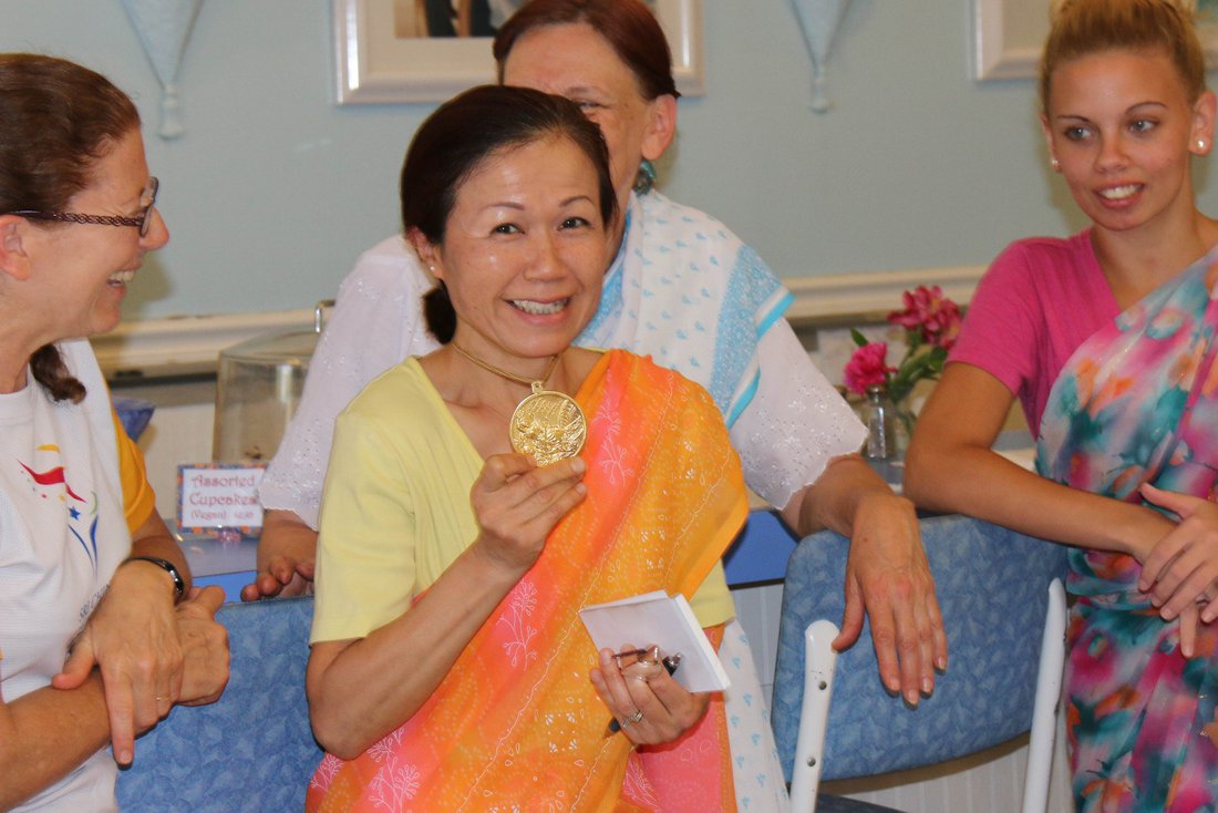 Cathy came from Fort Myers with her good friend, Leslie Bush, who won a gold medal for diving in the 1964 Olympic Games. Leslie brought her gold medal to show the children, and told them that her best memory of the Olympics was not winning the gold medal, but being in a harmonious environment with people from all different countries of the world.