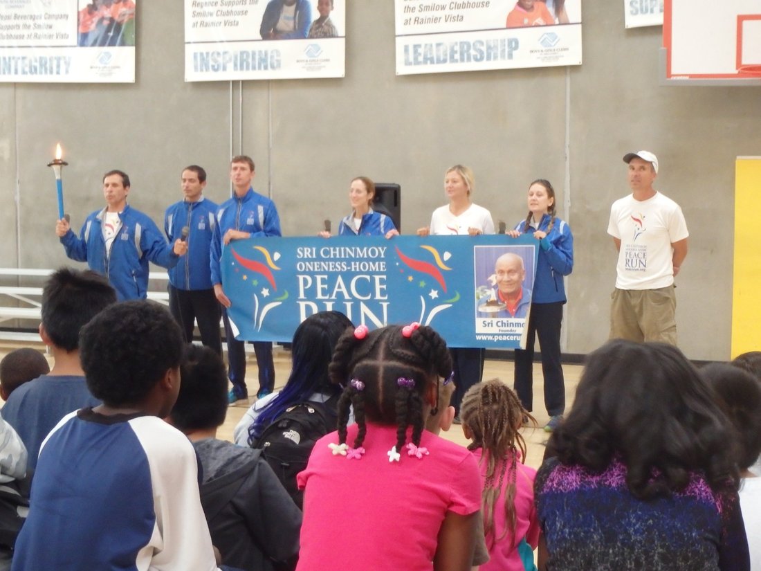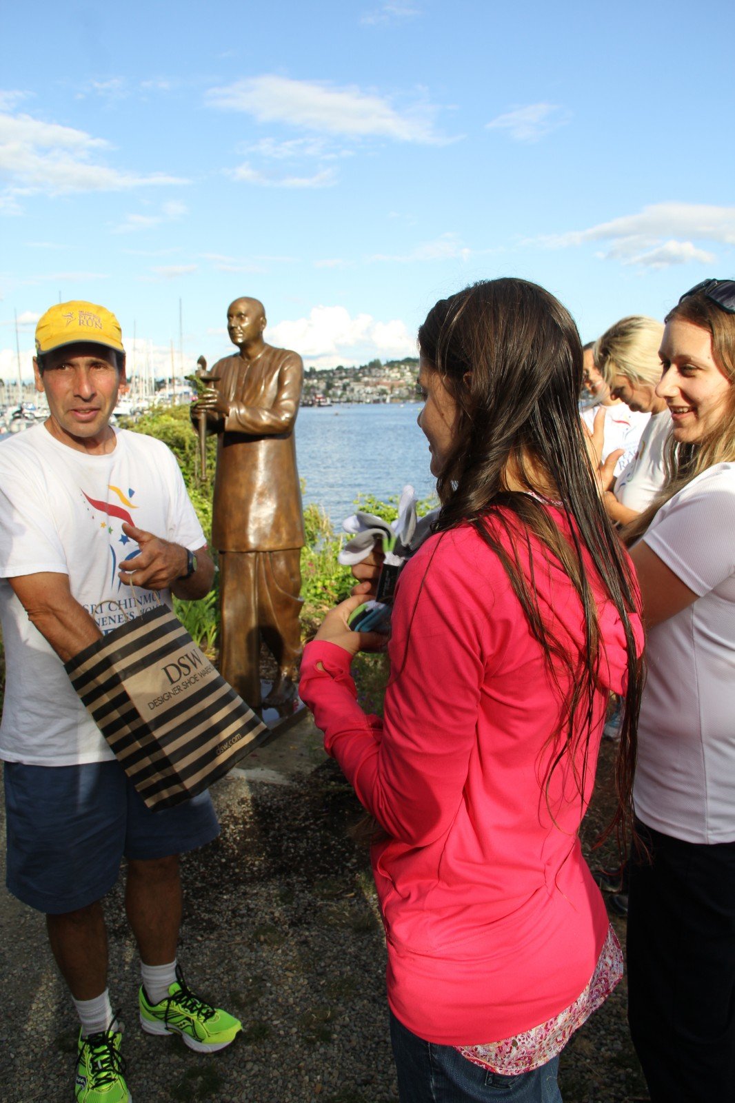 The whole Peace Run team including many Seattle locals who have contributed so much to these events gather next to the Statue. The surrounding area of spectacular beauty makes for a perfect setting for this wonderul peace monument.