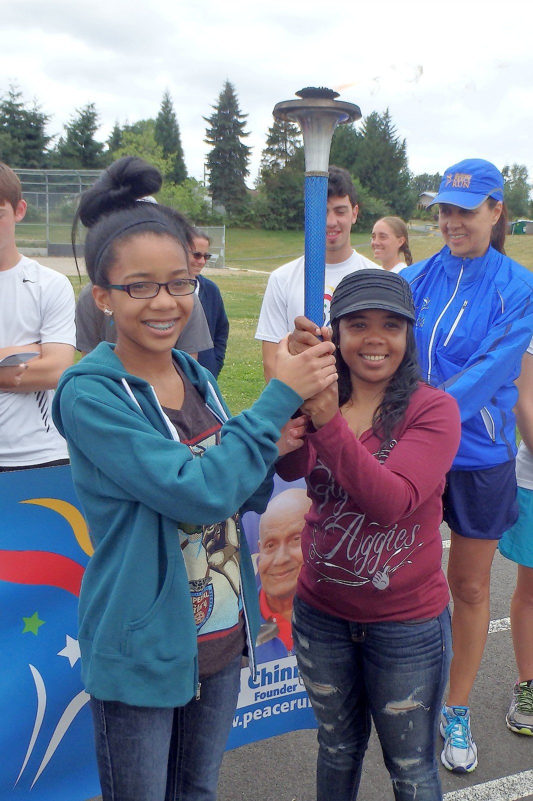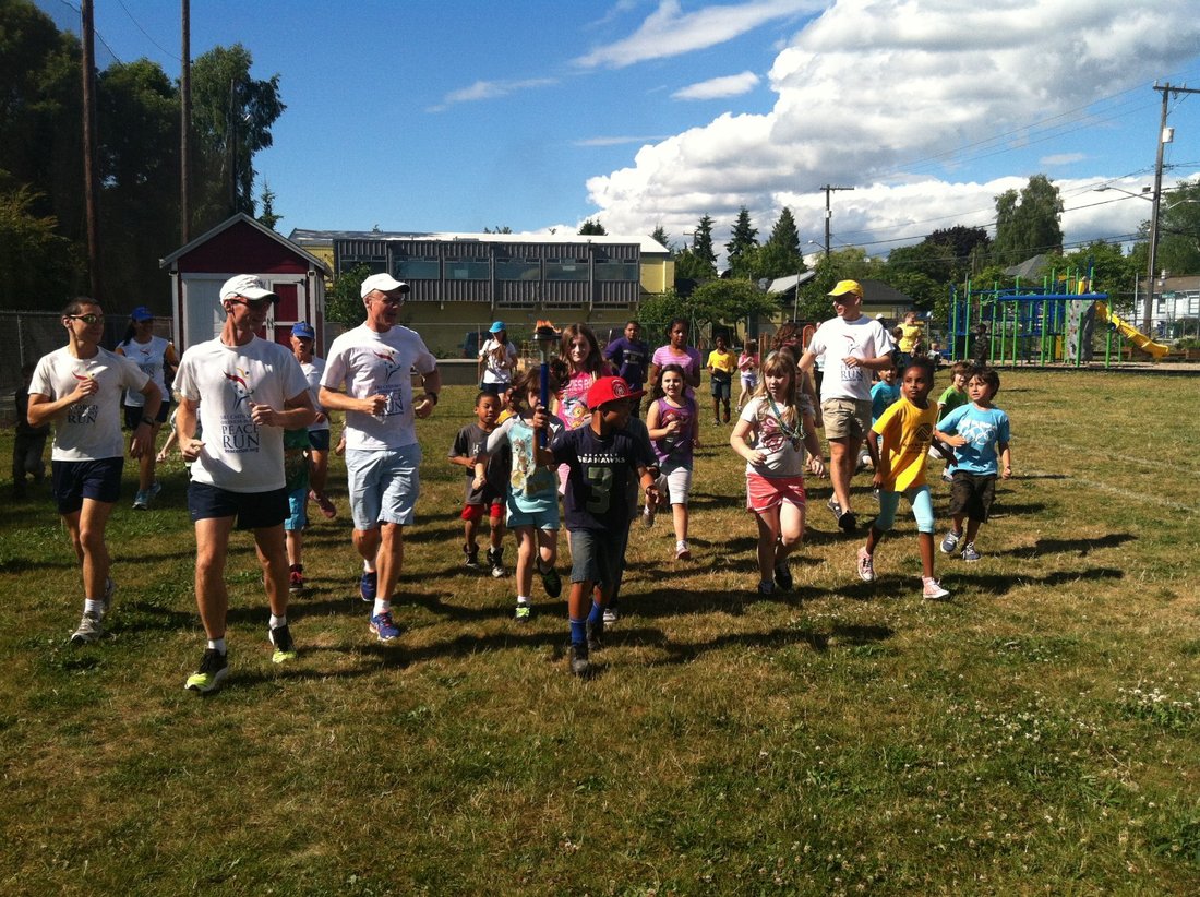The whole Peace Run team including many Seattle locals who have contributed so much to these events gather next to the Statue. The surrounding area of spectacular beauty makes for a perfect setting for this wonderul peace monument.