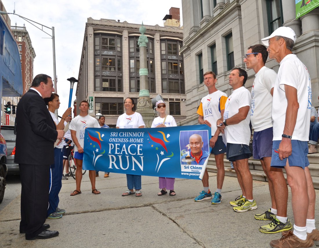 Doug Hadden, Communications Director represents Mayor Donald Grebien of the City of Pawtucket. Here he presents a Proclamation to the Peace Run and announces this day as 'Sri Chinmoy Oneness-Home Peace Run Day' in the City of Pawtucket.
