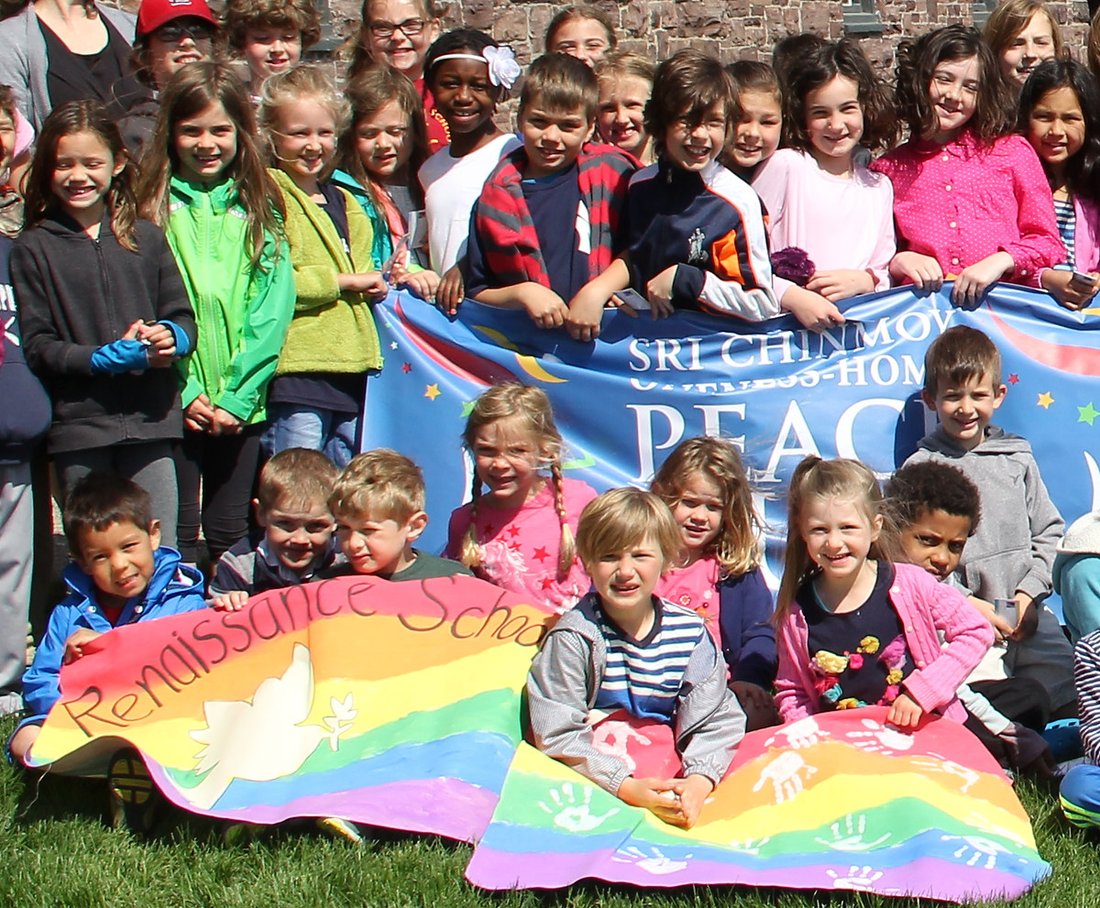 A wonderful group of young peace lovers show off their art work in this group photo with teachers and our own Peace Run members.
