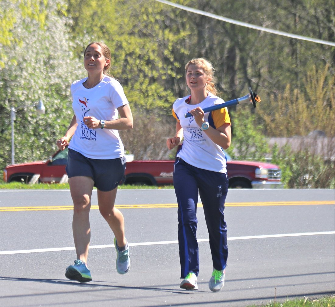 Two more happy runners, Akbota and Luana, proudly hold the torch of Peace high as they make their way to our first school ceremony of the day.