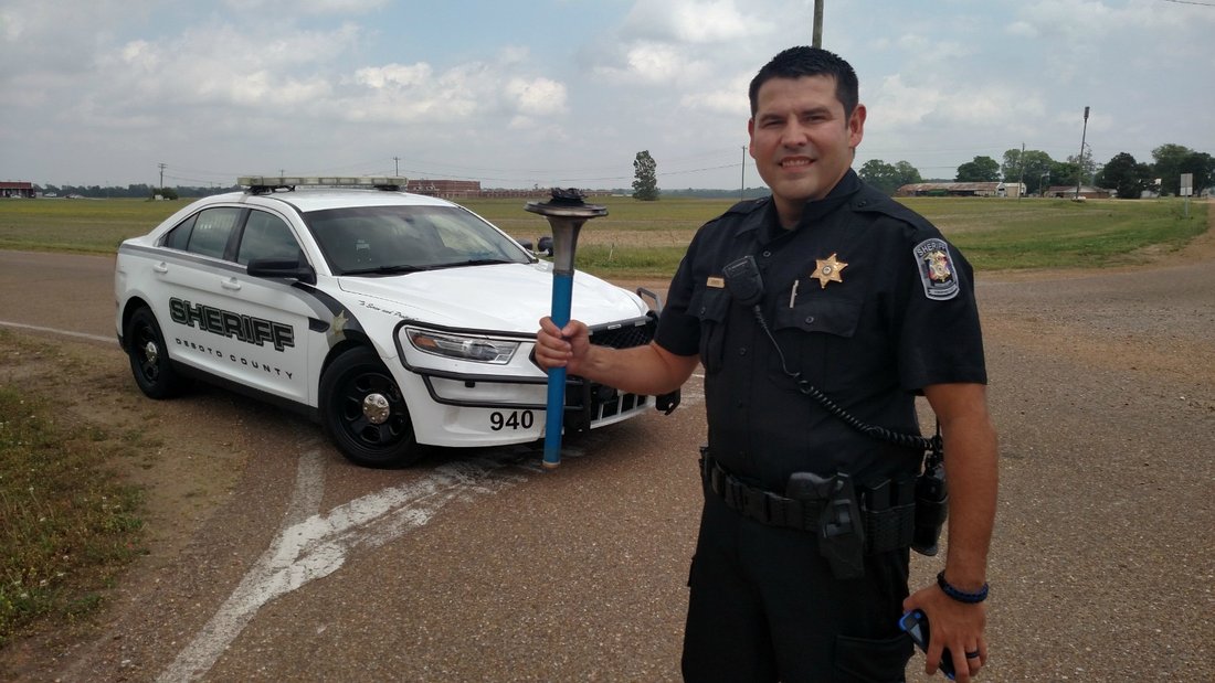 When this kind Sheriff, Officer Romero, stopped me as I was running along the highway to Memphis, I thought he was going to ask me to leave the road. But what he actually wanted was to hold the torch and get a photo of it. He said,"Sir, can you take a photo of me with the Peace Torch." This kind of spontaneous experience, especially with an officer of the law, really gives us joy and llifts our spirits as we run the busy highways.