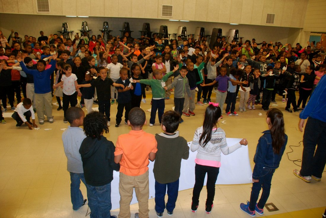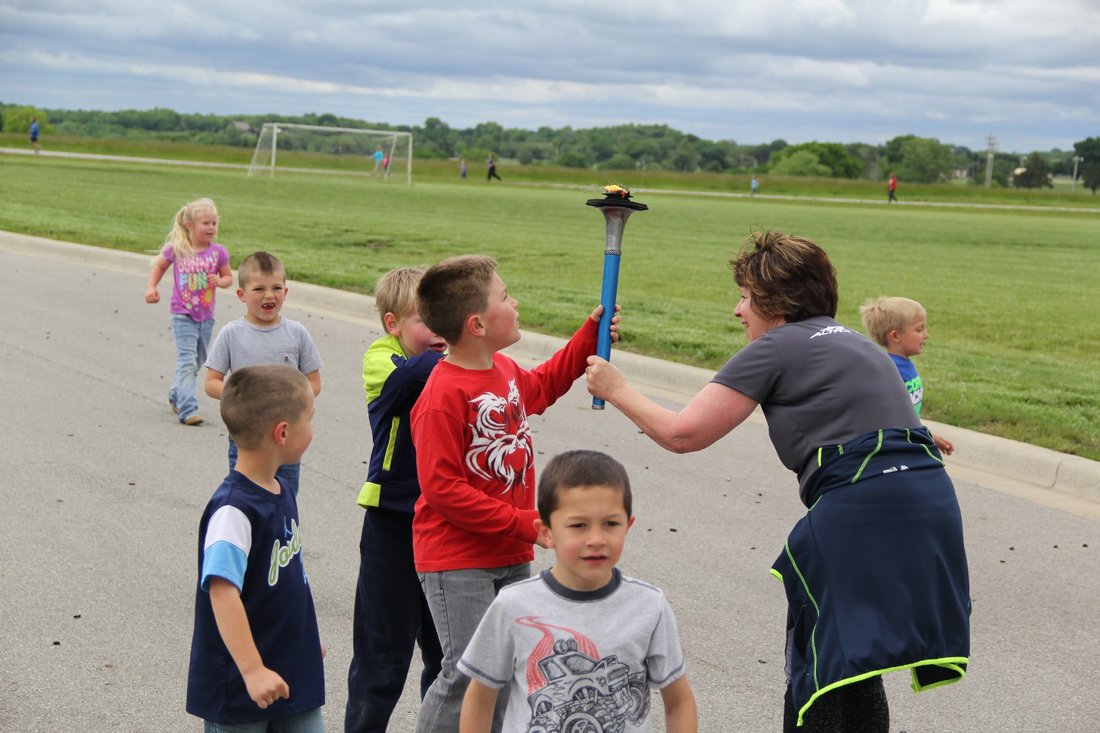 Principal Molly Struzzo holds the Peace Torch with some of the children who were very happy after a wonderful ceremony.