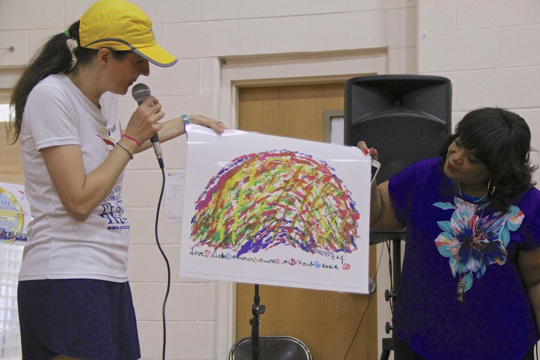 A print of Sri Chinmoy's artwork entitled "Love" was also given to the YWCA. To conclude, the team took the children for a short run around the gymnasium.