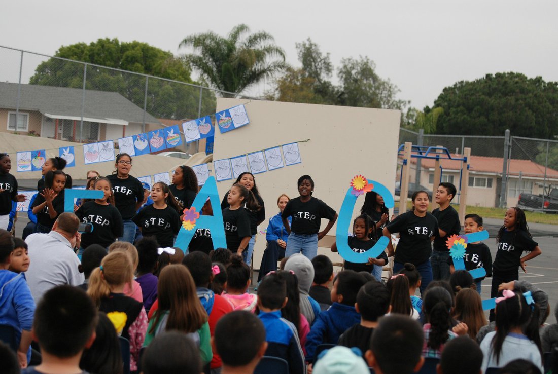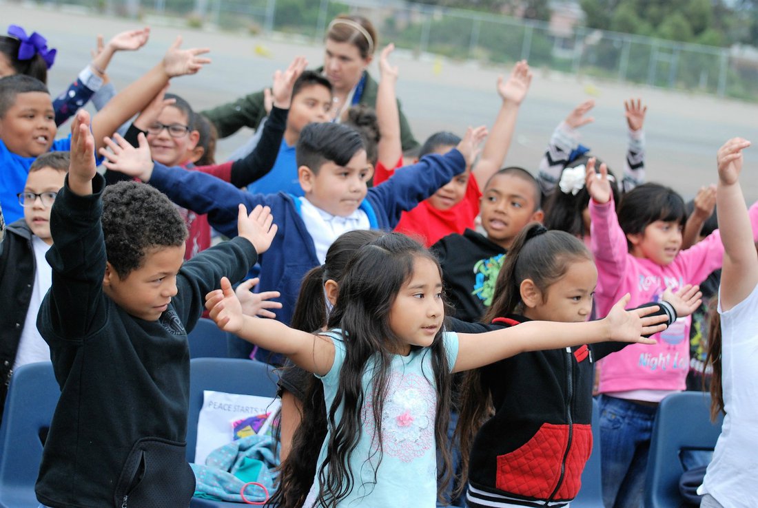 Cathy Oerter and Principal Shannon Lewis present awards to some of the children for excellence in art and the spoken word on the theme of peace.