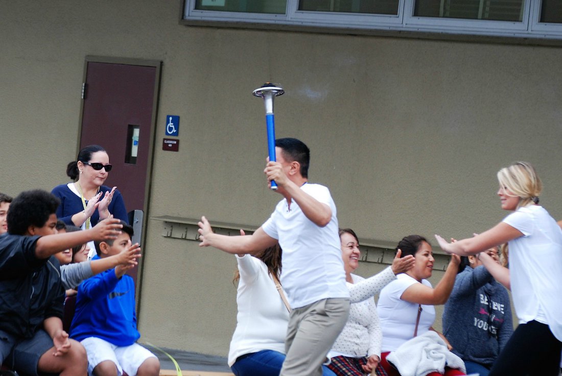 Roxanne Carrasco, Professional Actress and Liaison with Community Partners for this uniquely talented school, proudly holds the Peace Torch as Principal Tim Farson accepts the gifts of Appreciation from Prakhara.