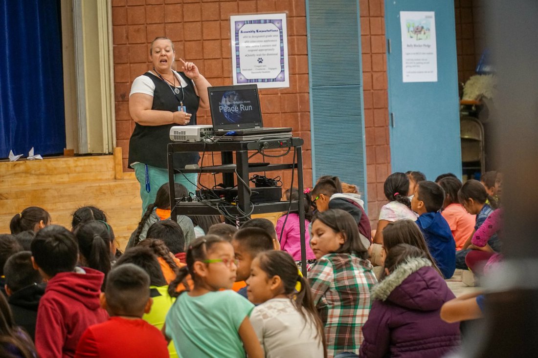 The ceremony at Montezuma Creek Elementary is on a Navajo Reservation. Running comes naturally to the Navajo. When asked who loves the sport the team got their most unmainous response yet. The kids watched the video.