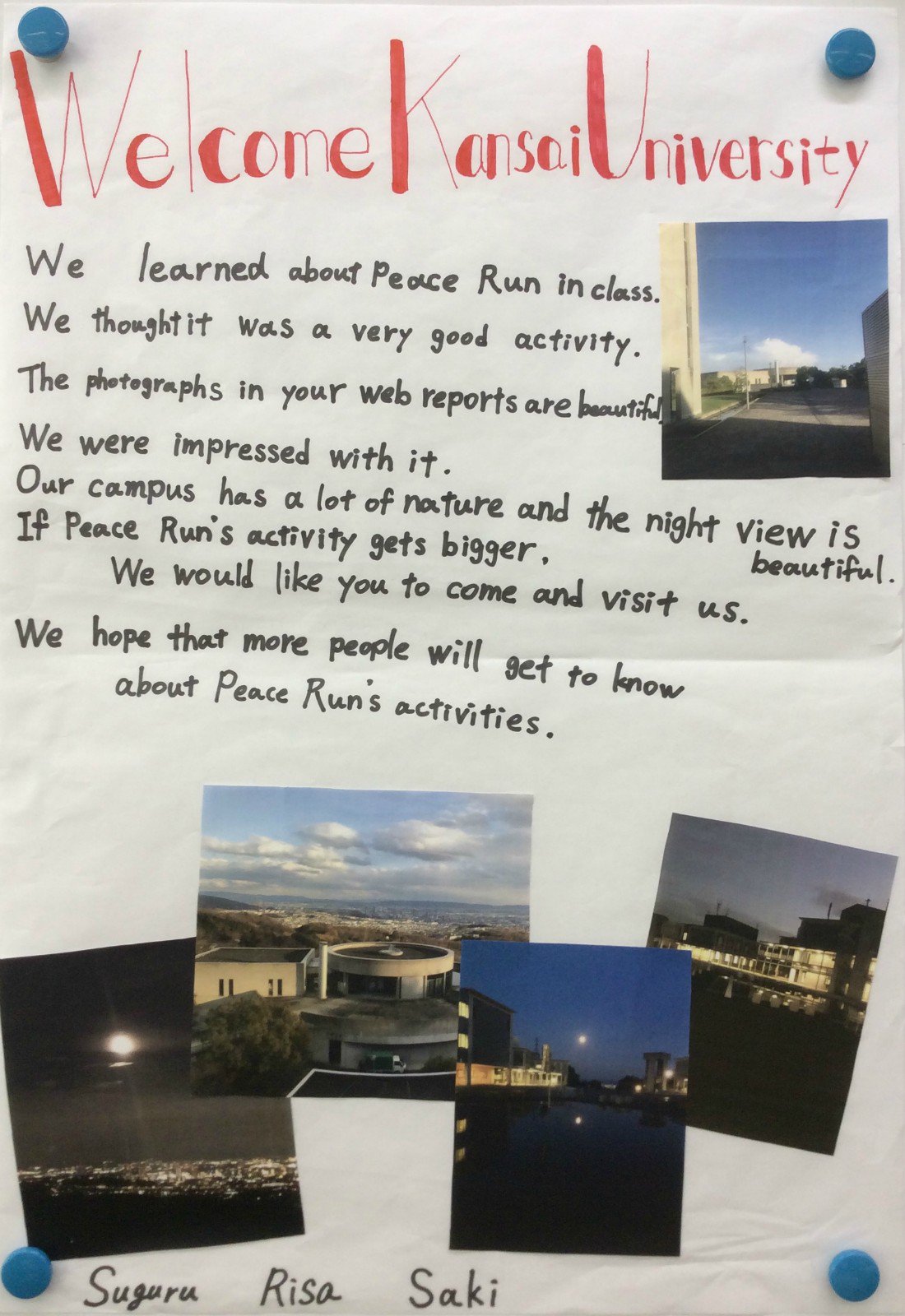 We are Japanese students. We first learned about Peace Run in Professor Harashita's class and it was a wonderful activity. The children who participated in Peace Run looked very sincere and having fun. We are happy to look at the pictures, and can feel the connection of people. We were surprised that you are running a very long distance. You must have passion for peace. In Peace Run, everyone can run regardless of economic situation and race . It is wonderful that people from all over the world can participate. Not seeking specific political or monetary interests, is awesome. You still have a long way, but keep going!!