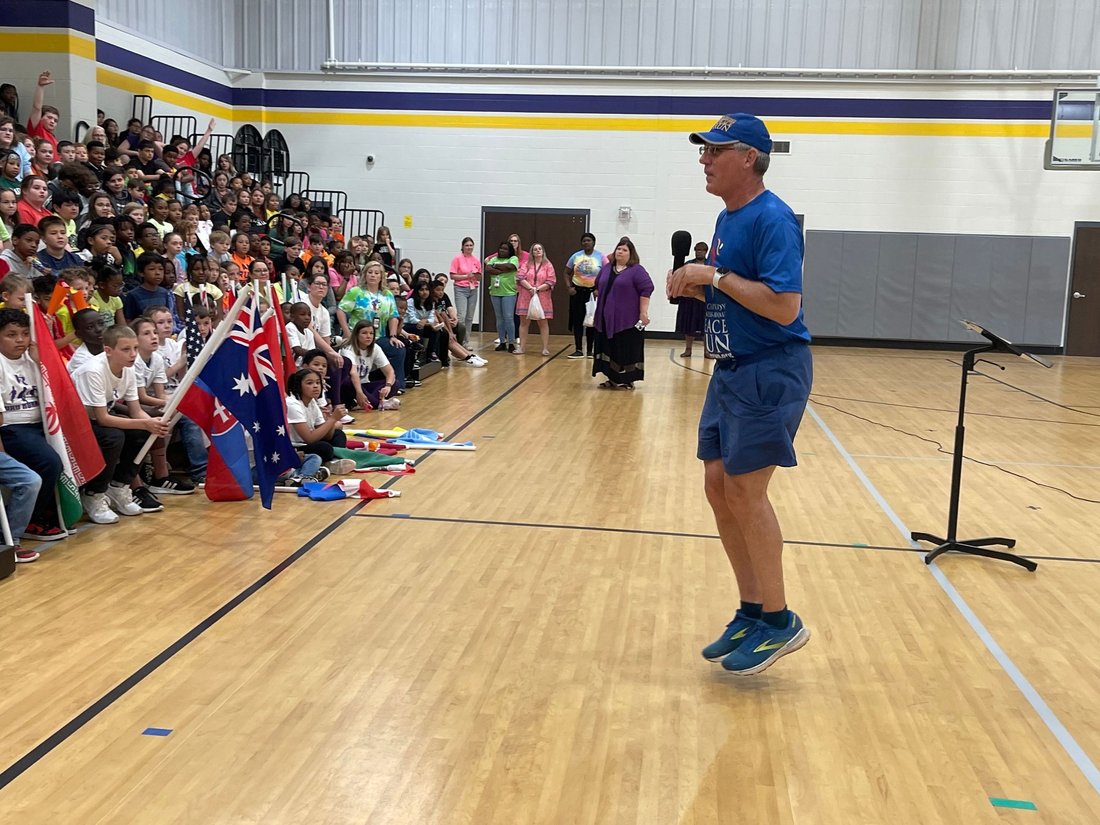Brittany Gore, the coach of the student 'Road Runners', organized this group of children to run with the Peace Torch outside. They ran around the front of the school passing by the other students who lined up to offer their farewell wishes as we move on down the road towards Alabama.